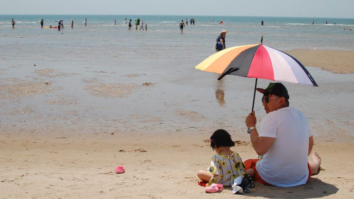 It's way up on the Bohai Sea, which means the water is calm and a little murky, and there’s a cargo ship out there on the hazy horizon. The beaches are flat and the sand is brown and squishy. You can wander way out and still be only knee-deep in warm, softly lapping waves. It’s a place for splashing and wading, rather than surfing or actual swimming.
